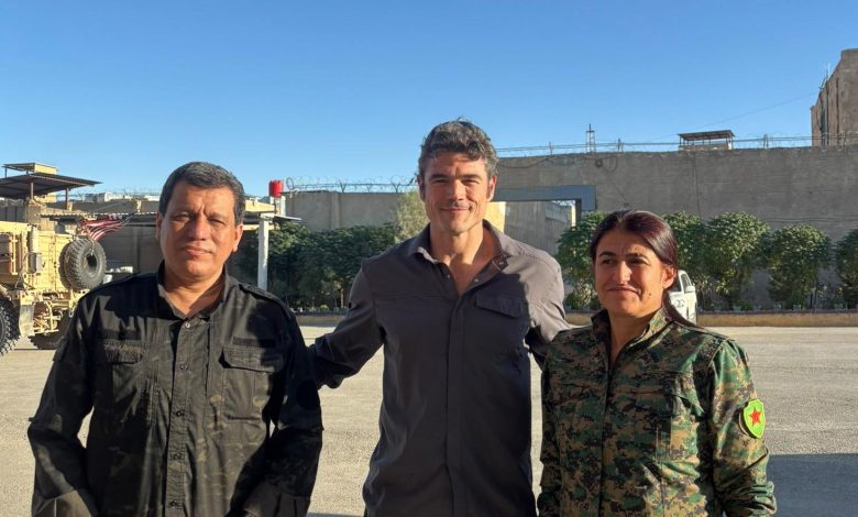 وتظهر الصور التي أرفقها “كينت” على حسابه لقائه مع القيادية في وحدات حماية المرأة روهلات عفرين، والقائد العام لقوات سوريا الديمقراطية، الجنرال مظلوم عبدي، وجنود عراقيين.