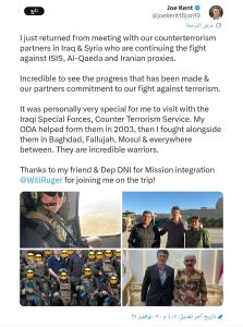 ونشر مدير المركز الوطني الأمريكي لمكافحة الإرهاب،جو كينت عبر حسابه في منصة “إكس”: “لقد عدت للتو من اجتماع مع شركائنا في مكافحة الإرهاب في العراق وسوريا الذين يواصلون القتال ضد داعش والقاعدة والجماعات الموالية لإيران.